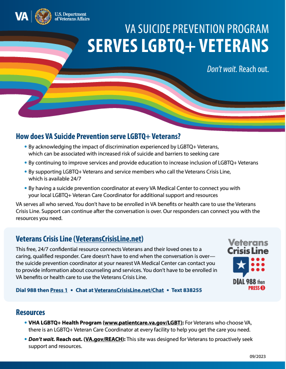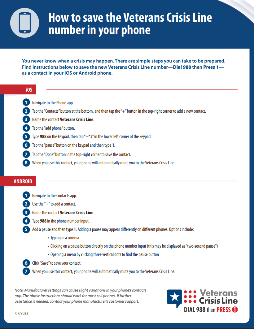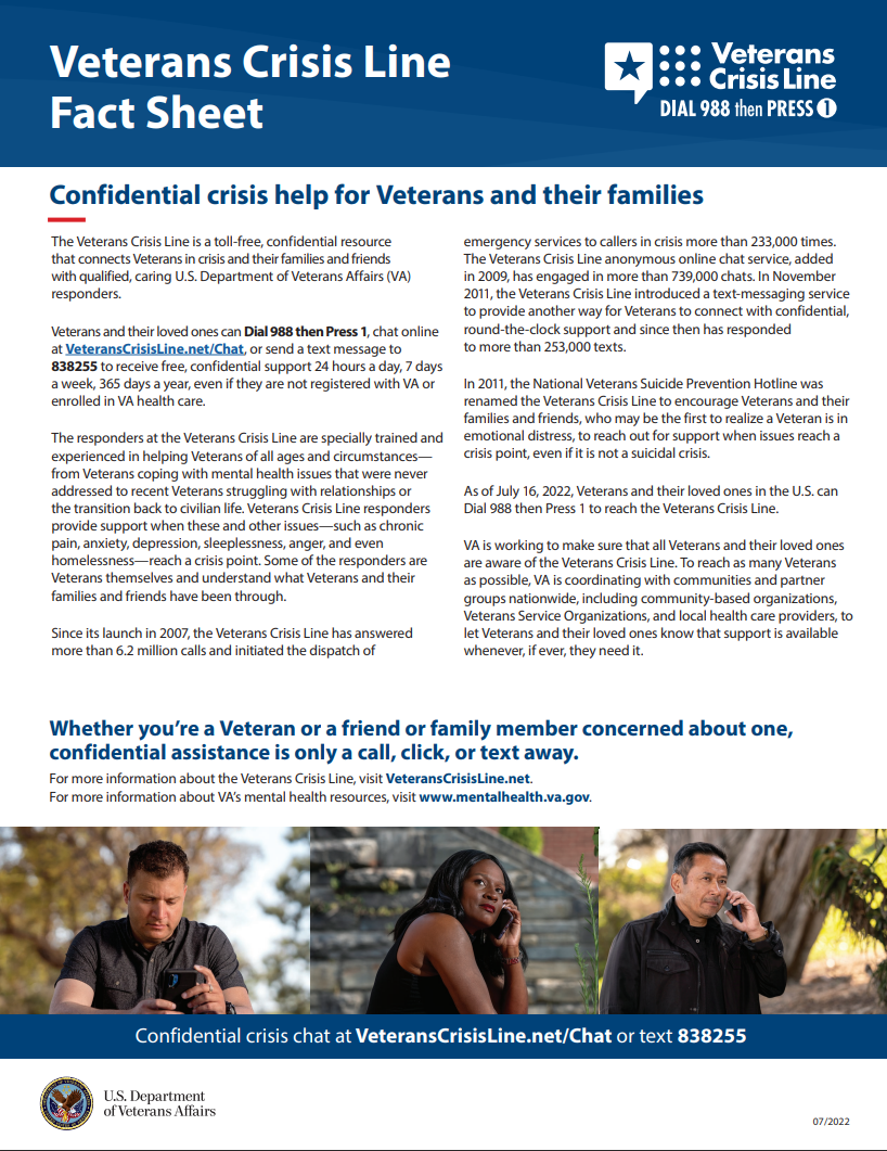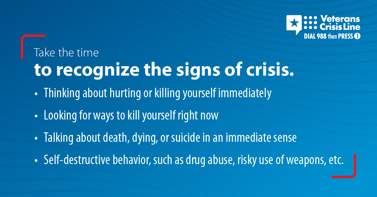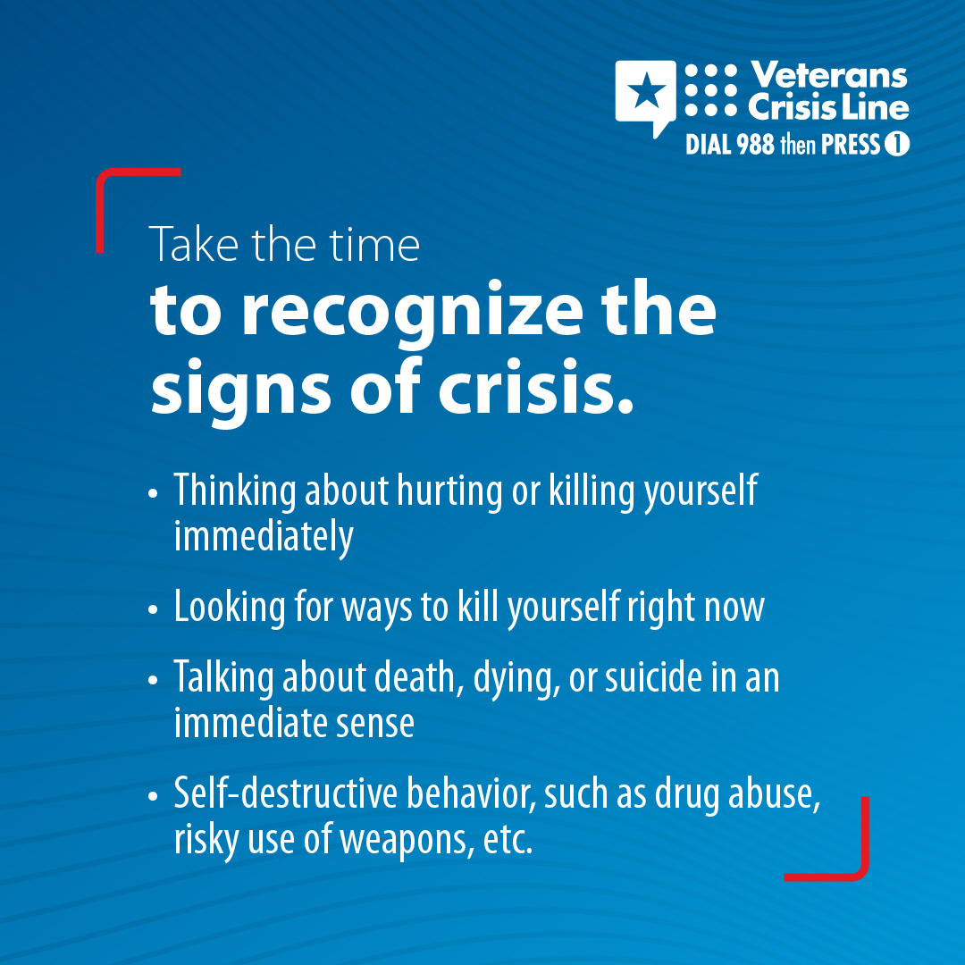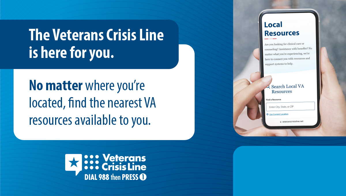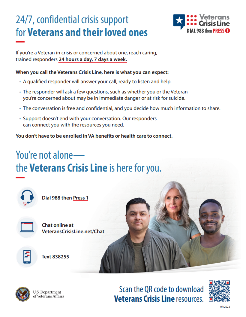 !The Veterans Crisis Line offers support 24/7. If you’re a Veteran in crisis or worried about a Veteran, call, chat, or text now.